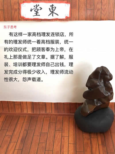 有这样一家高档理发连锁店,所有的理发师统一着高档服装,统一的欢迎仪式,把顾客奉为上帝,在礼上那是做足了文章。据了解,服装、培训都要理发师自己出钱,理发完成分得极少收入,所以理发师流动性很大,怨声载道。我觉得领导没有按照道来做,而是走捷径,把礼做好,站在了华的一面。做为领导应该为手下的员工考虑,让他们在稳定的工作环境中,在物质和精神上得到满足,只有这样,公司才能走进良性循环,才能为更多的民众提供服务。